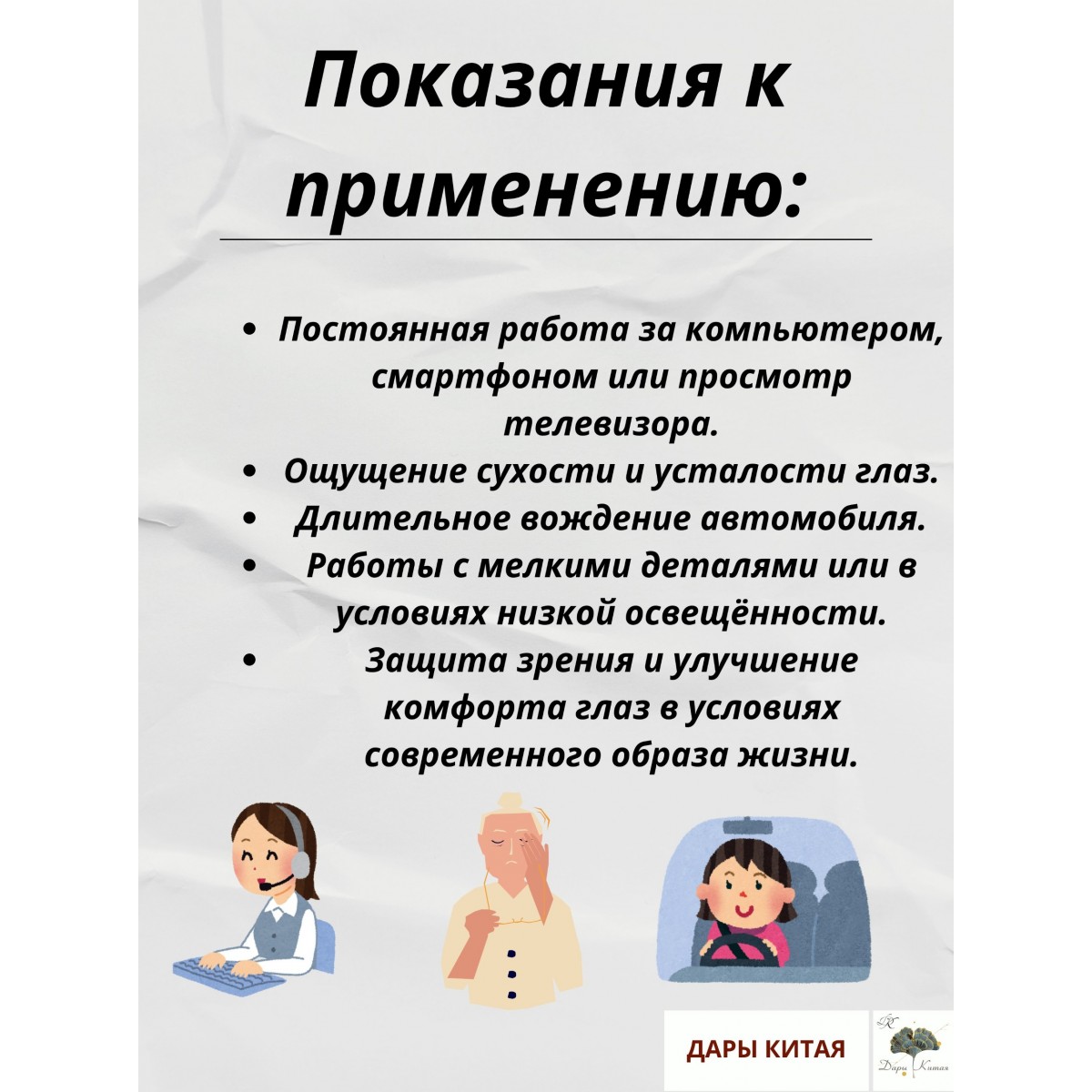 Снятие усталости и устранение сухости. Быстро возвращают чёткость зрения и комфорт после длительной работы или напряжения.