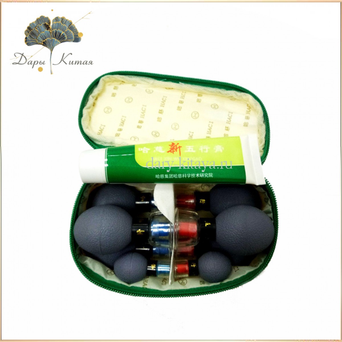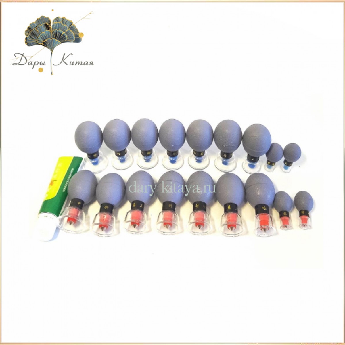 В комплекте имеется книжка, где указаны схемы и время применения банок по разным заболеваниям. А также массажный крем, который необходим для процедур. В комплекте баночки