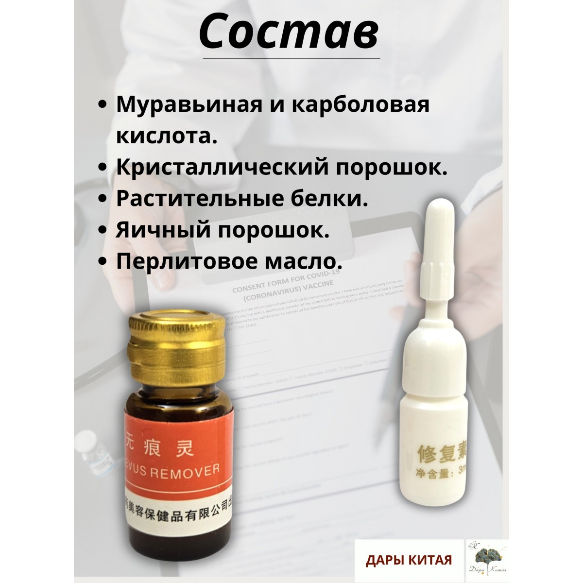 пластиковый флакон для восстановления после удаления кожи. Состав препарата включает муравьиную и карболовую кислоты, кристаллический порошок, растительные ингредиенты, яичный порошок и перлитовое масло, что делает его эффективным и безопасным в использовании.
