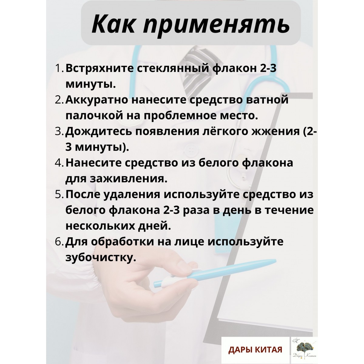 Перед использованием осторожно встряхните стеклянный флакон на 2–3 минуты до получения образцов массы. Переносите средство на проблемное место с помощью ватной палочки, избегая контакта с здоровой кожей. Через несколько минут, когда вы почувствуете легкую острую боль, внесите средство из белого флакона для ускоренного заживления. После полного удаления образования продолжайте использовать средство из флакона сердца 2-3 дня, 2-3 раза в день, до полного восстановления кожи.