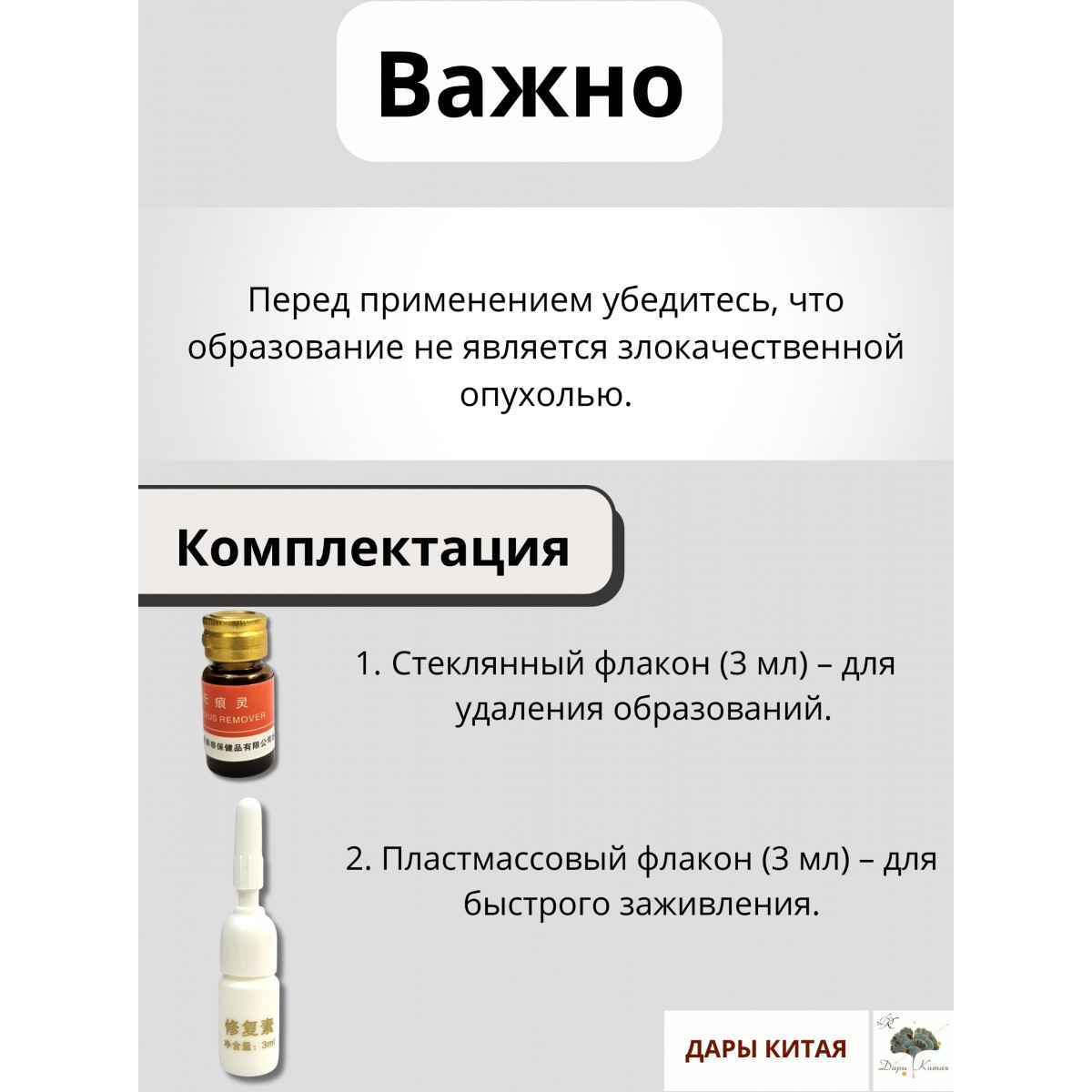 В комплект поставки входят два флакона: стеклянный флакон для удаления образований и